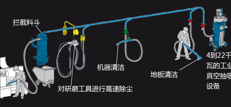 系統(tǒng)由主機(jī)箱、濾塵桶、集塵桶、吸塵管網(wǎng)等組成